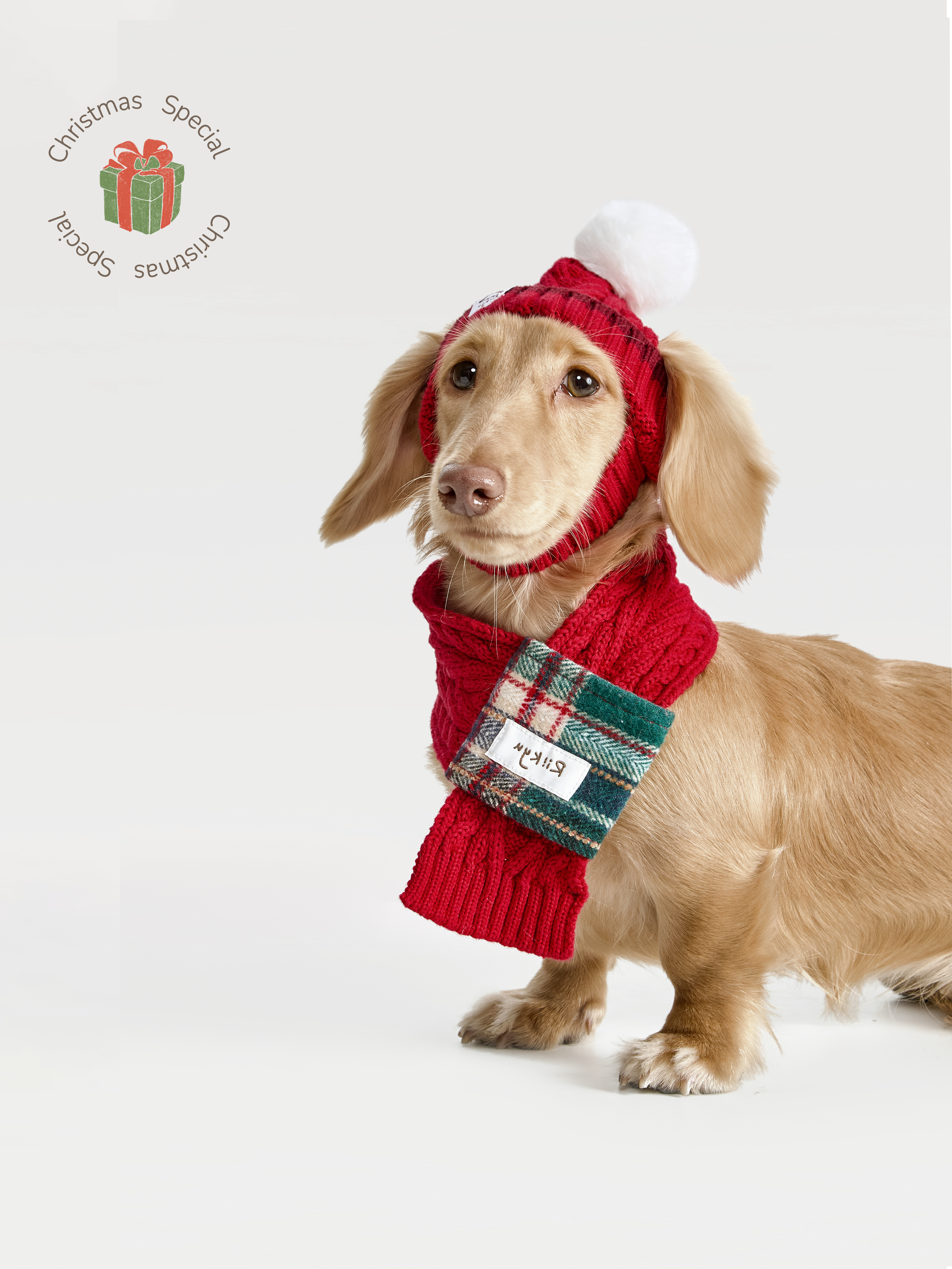 A Christmas set woven in quiet celebration. Classic holiday colours meet gentle plaid and carry the warmth of winter in every thread. A soft scarf and a beanie wrap the season’s comfort around your furry friends and turn simple moments into something tender.
