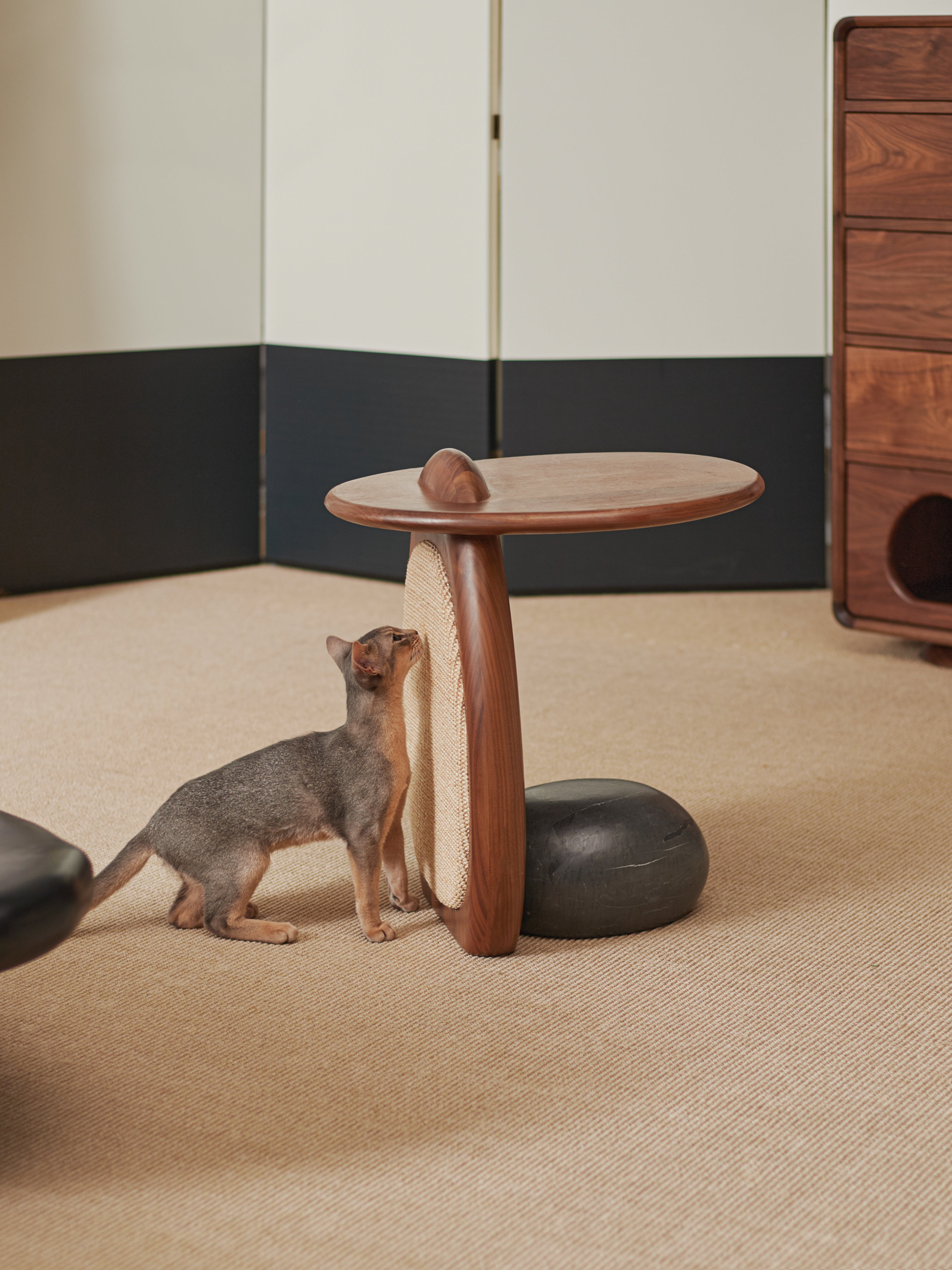 It is a shared furniture for cats and owners. While owners enjoy the side table, cats can relieve stress on the scratching board. This opens up new possibilities for human-pet interaction.